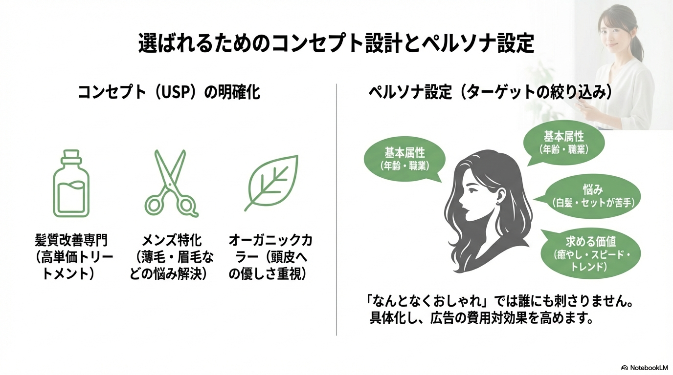 選ばれるためのコンセプト(USP)の明確化と、ターゲットの絞り込みを行うペルソナ設定について解説しています。