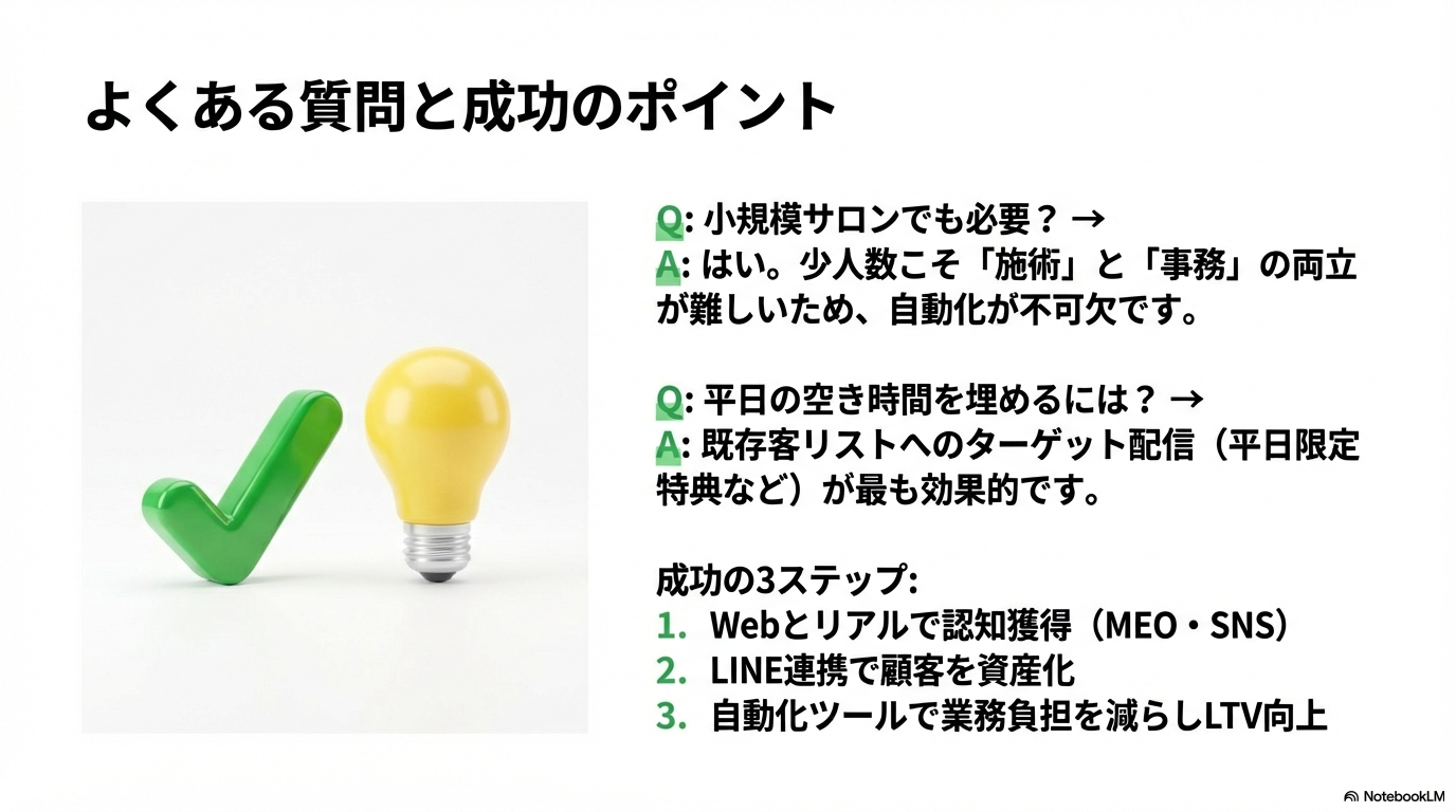 小規模サロンの必要性と平日集客、そして集客成功のための3ステップをまとめた質疑応答スライドです。