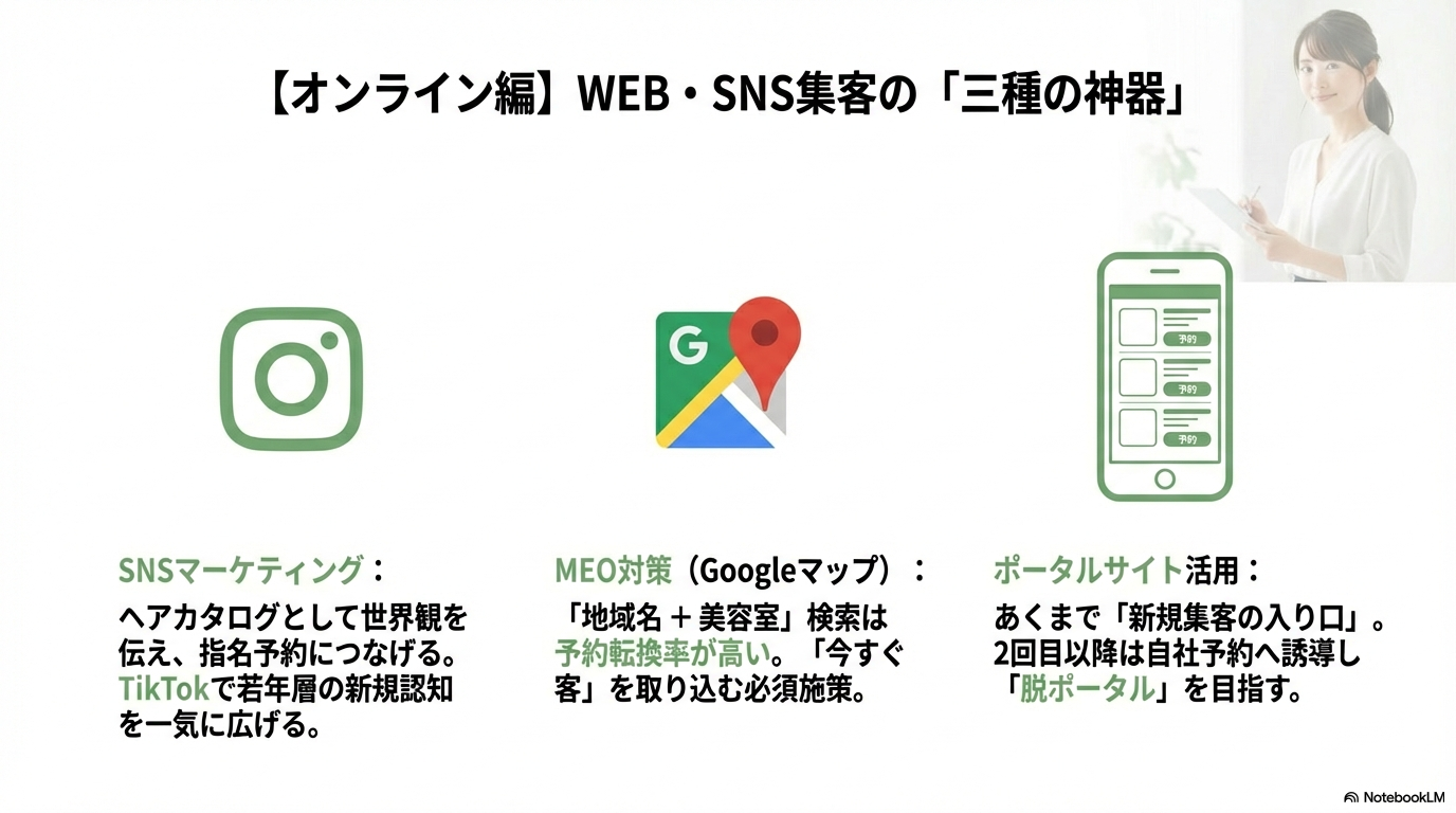 オンライン集客の三種の神器として、SNSマーケティング、MEO対策、ポータルサイト活用を紹介しています。