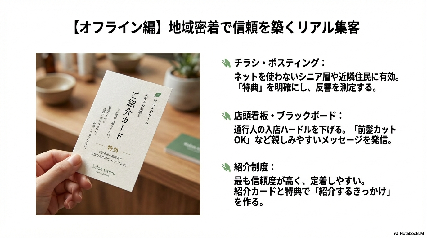 オフライン集客として、チラシ、店頭看板、紹介制度の三つの地域密着戦略を説明しています。