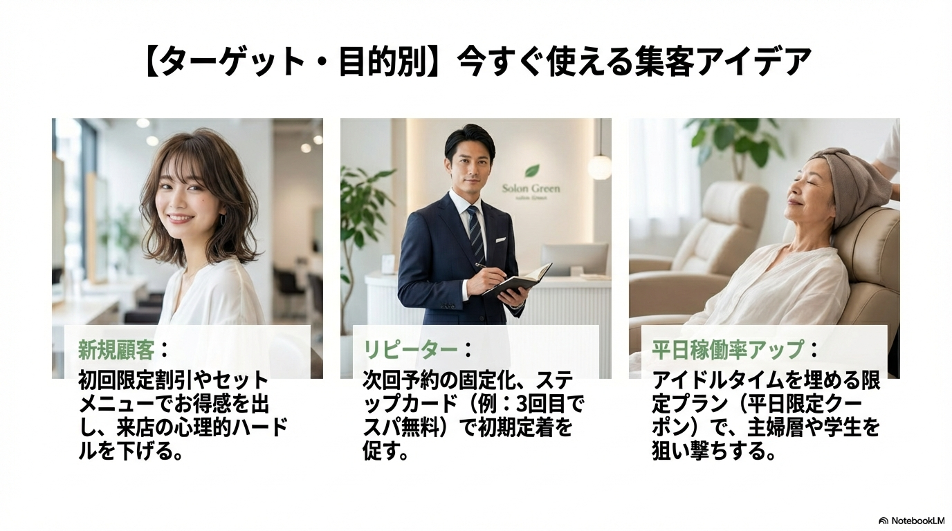 新規顧客、リピーター、平日稼働率アップの三つの目的別に具体的な集客アイデアを提案しています。
