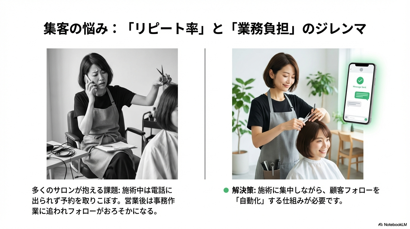 リピート率向上に必要な顧客フォローと、施術中の業務負担増大のジレンマ、そして自動化による解決策を示しています。