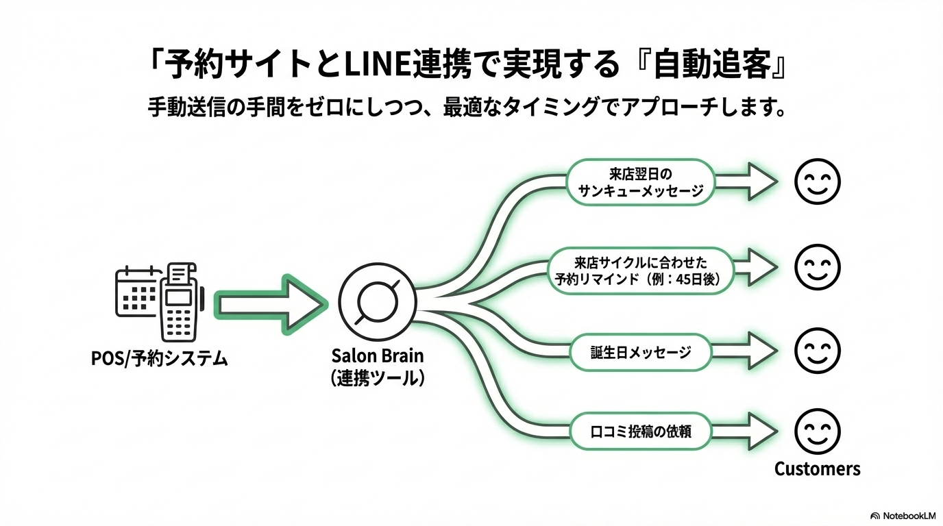 この課題を解決するのが、予約サイト(POS)とLINE公式アカウントを連携させるツール(Salon Brainなど)です。