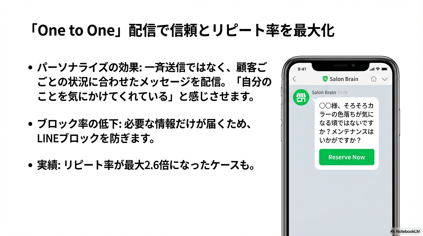 このように「自分のことを気にかけてくれている」と感じさせるメッセージは、顧客との信頼関係(エンゲージメント)を深め、LINEのブロック率を下げる効果もあります。Salon Brainの導入実績では、リピート率が最大2.6倍になったケースも報告されています。