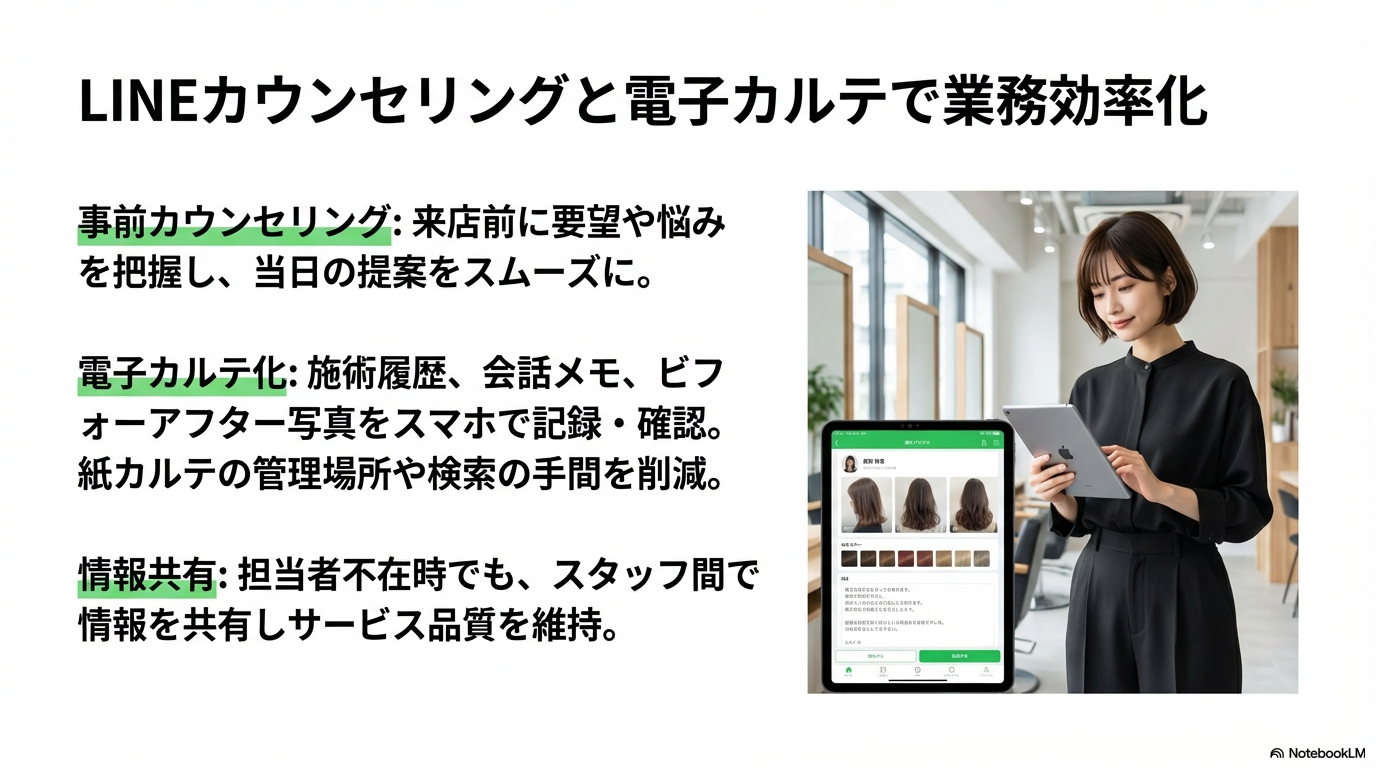 LINE上で事前カウンセリングやカルテ管理を行うことで、接客品質と業務効率を同時に向上させることができます。