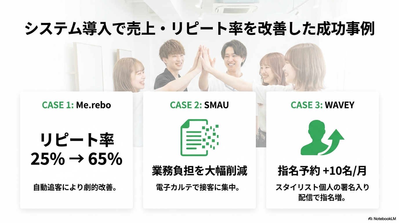 システム導入による売上とリピート率改善の成功事例を3つ(リピート率向上、業務負担削減、指名予約増)示しています。