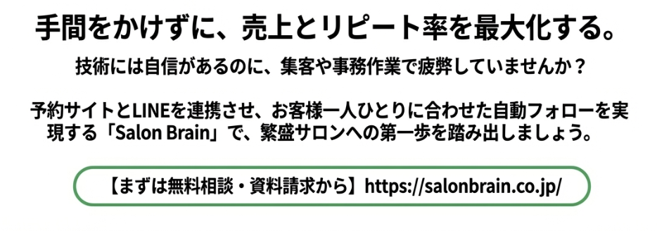 特に、小規模サロンにおいて「時間がない」「マメな連絡ができない」という課題は、システムを導入することで劇的に改善できます。予約サイトとLINEを連携させ、お客様一人ひとりに合わせた自動フォローを実現する「Salon Brain」を活用して、手間をかけずに売上アップを目指しましょう。