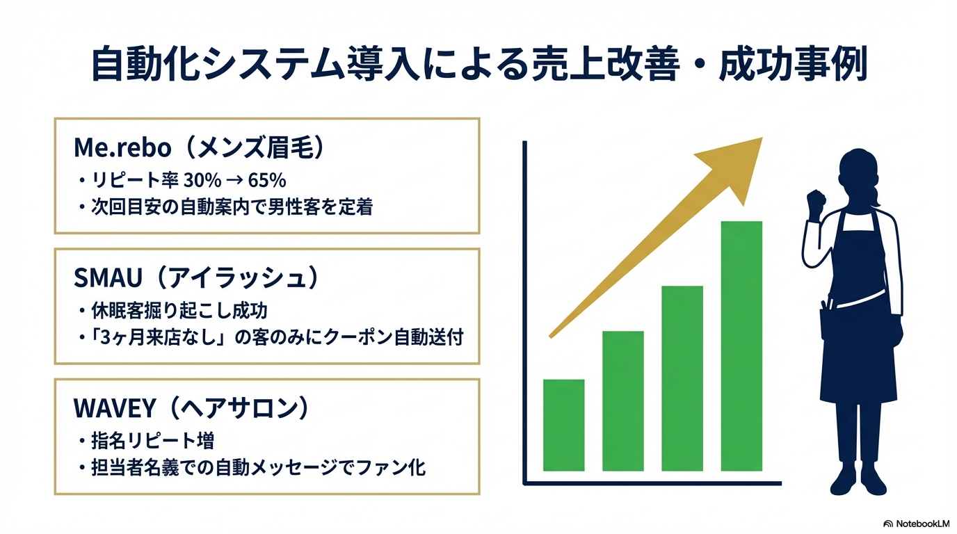 具体的には、施術後のアフターケア情報と次回目安の自動配信を徹底。スタッフが追客に時間をかけることなく、システムが自動で再来店を促すことで、リピート率65%という高水準を達成しました。
