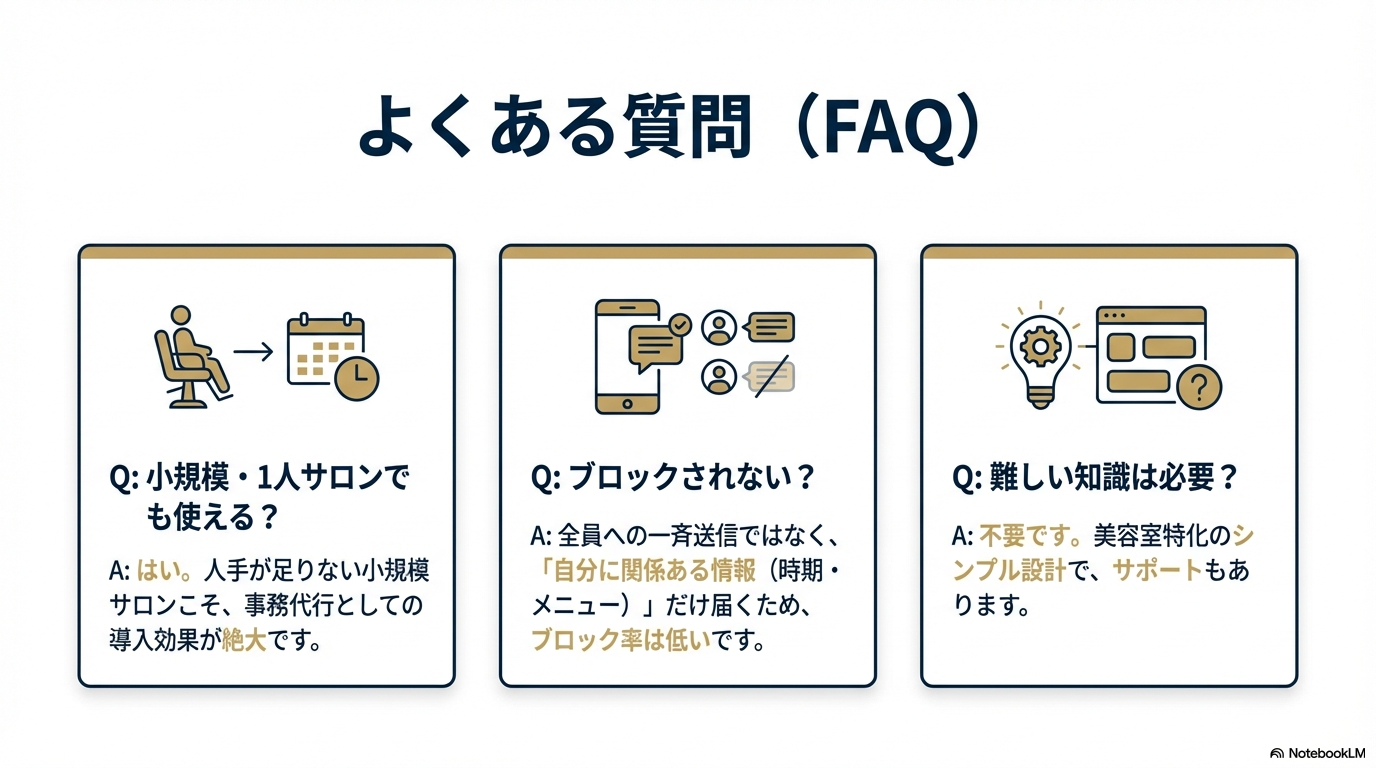 A. はい、可能です。むしろ、人手が限られている1人経営や少人数のサロンこそ、事務作業を自動化するメリットが大きいため、導入を強くおすすめします。