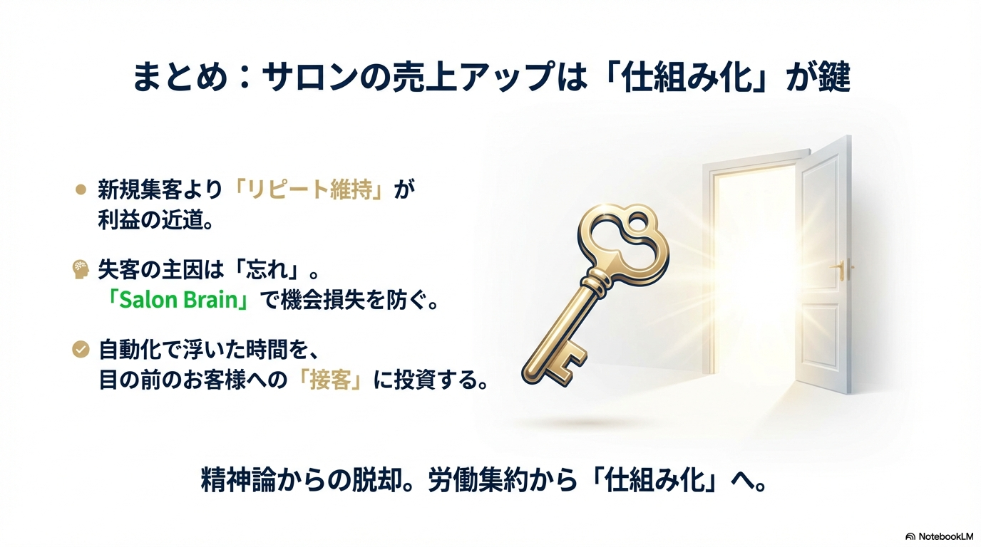 厳しい市場環境の中でサロンが生き残るためには、精神論や個人の頑張りに依存せず、ツールを使って「売れる仕組み」を構築することが最短ルートです。