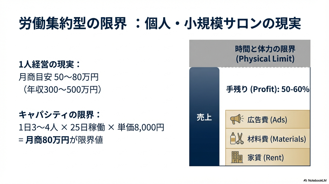 これは、スタイリスト1人が1日に施術できる人数に物理的な限界(キャパシティ)があるためです。高単価店でない限り、身体一つで上げられる売上には天井があります。