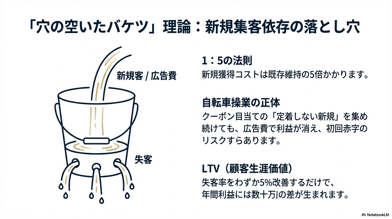 サロン経営はいわば「穴の空いたバケツに水を注ぐ作業」に似ています。バケツの穴(失客)を塞がないまま、新規客という水を注ぎ続けても、売上は蓄積されず、常に集客コストがかかり続けます。