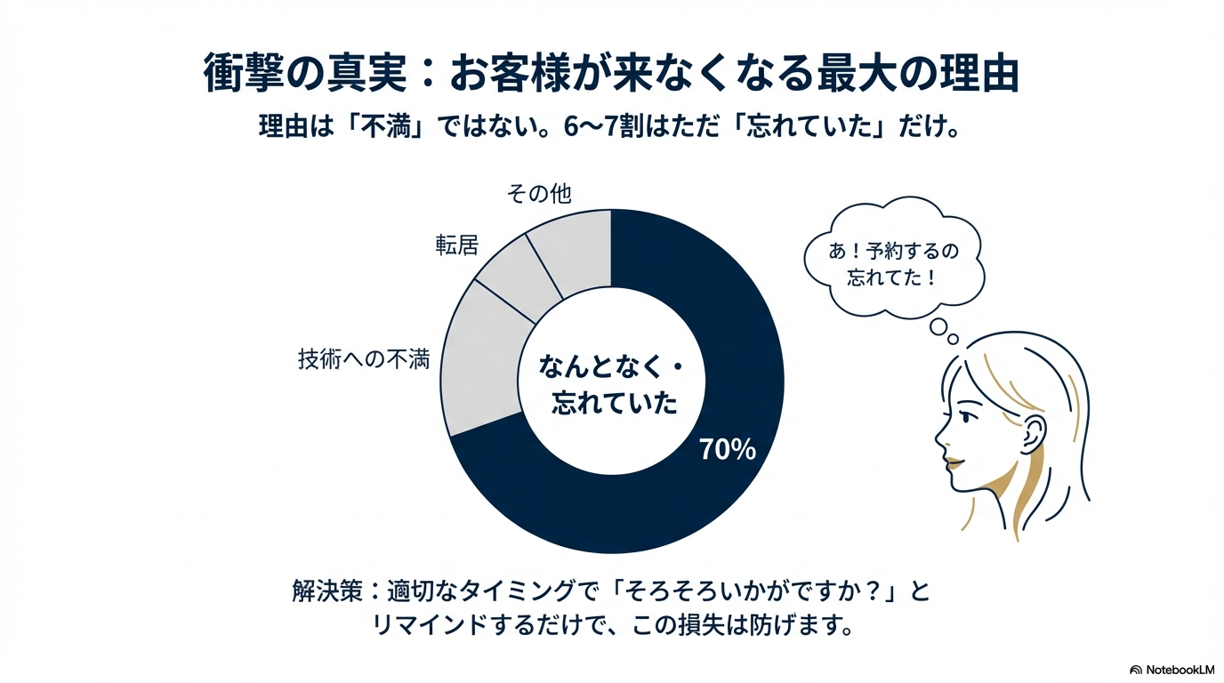 衝撃的な事実ですが、顧客が来店しなくなる最大の理由は「技術への不満」ではなく、「なんとなく(忘れていた)」です。