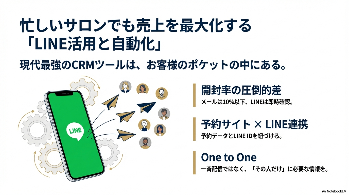結論から申し上げますと、忙しいサロンが売上を伸ばすための鍵は「リピート率の向上」と「業務の自動化」にあります。特に、予約サイトとLINEを連携させた「攻めの顧客管理」は、人手不足の小規模サロンにこそ必須の戦略です。