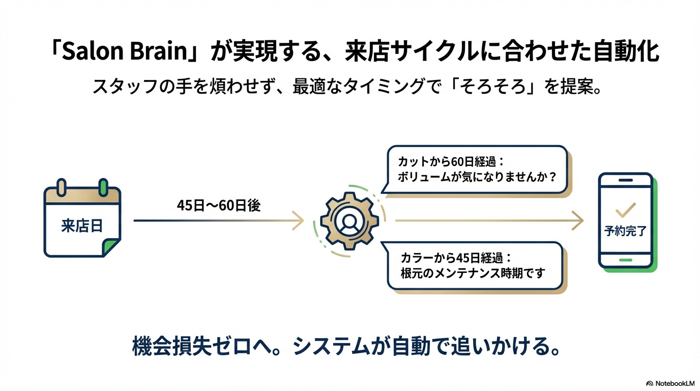 スタッフが手動でカルテを確認し、一人ひとりにLINEを送る作業は膨大な時間がかかりますし、送り忘れも発生します。Salon Brainはこの「機会損失」をゼロにします。