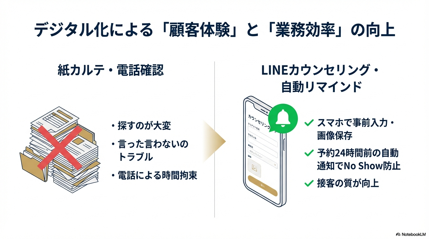 電話での確認はスタッフの時間を奪いますし、仕事中のお客様にとっても負担です。LINEの自動通知なら、双方がストレスフリーで確実です。