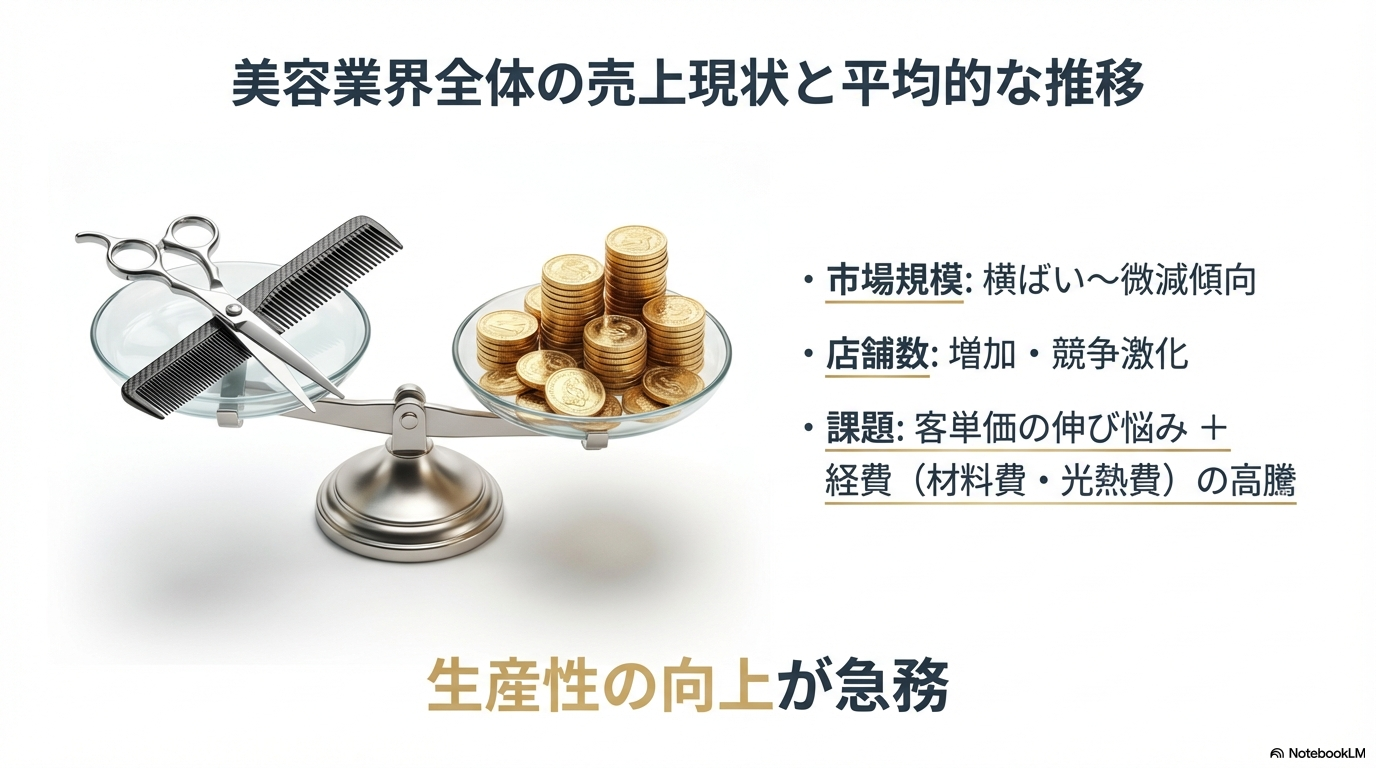 多くのサロンが抱える課題は「客単価の伸び悩み」と「経費の高騰」です。材料費や光熱費が上がり続ける中、1店舗あたりの売上が減少しているケースも少なくありません。厚生労働省の資料などを見ても、生産性の向上が急務であることがわかります。