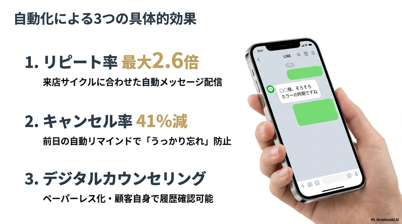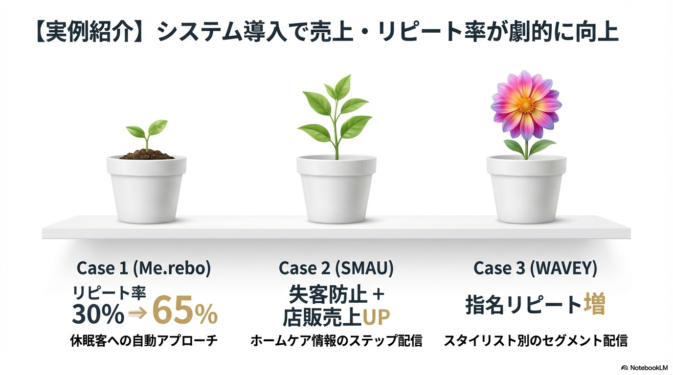 顧客の来店サイクルに基づき、「そろそろカラーのリタッチ時期ではありませんか?」といった個別メッセージを自動配信することで、一斉配信のメルマガとは比較にならない効果を発揮します。