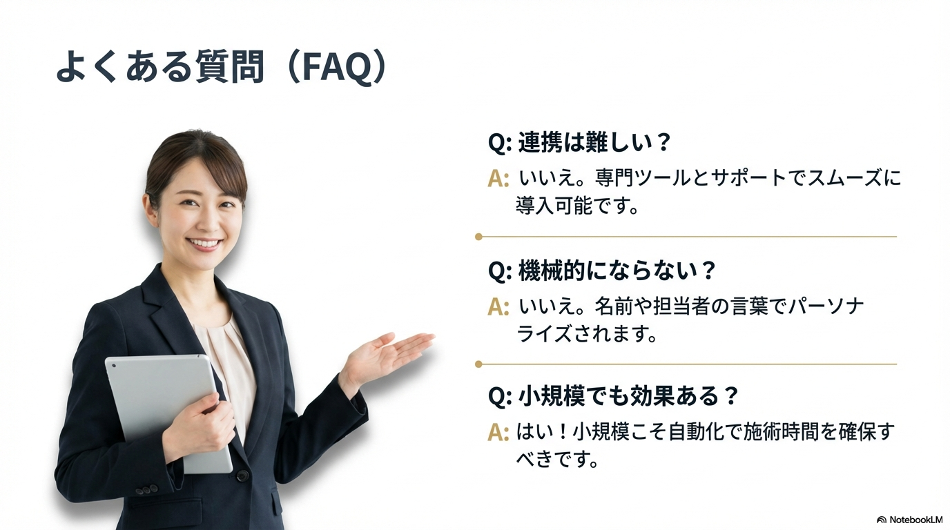 はい、むしろ小規模サロンこそ効果的です。人手が足りないサロンほど、予約確認や追客などの事務作業を自動化することで、接客や技術に集中できる時間が増え、結果として売上アップに繋がります。