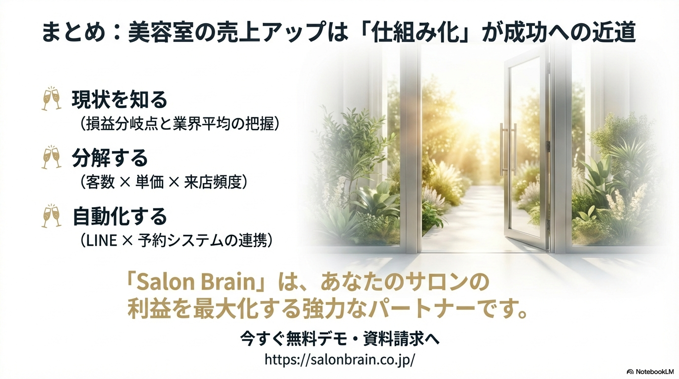 予約サイトとLINEを連携させる「Salon Brain」なら、これらの課題を一挙に解決し、あなたのサロンの利益を最大化する強力なパートナーとなります。まずは無料デモや資料請求で、その効果を体感してみてください。