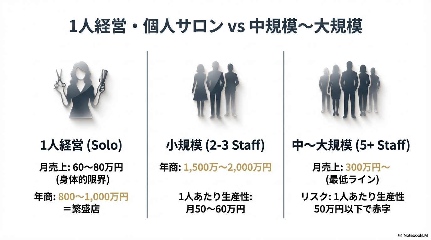 | リスク | 自分が倒れたら売上ゼロ | スタッフの離職・教育コスト |