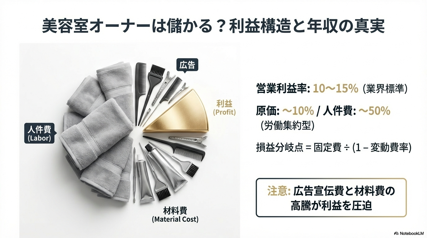 一般的な美容室の営業利益率は10〜15%程度と言われています。