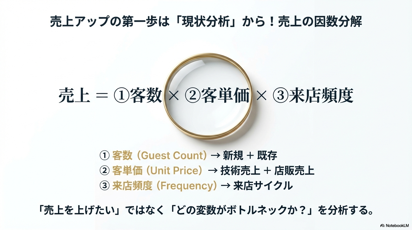 「単価を500円上げる」「来店サイクルを1週間早める」など、どの変数がボトルネックになっているかを特定し、具体策に落とし込むことが改善の第一歩です。