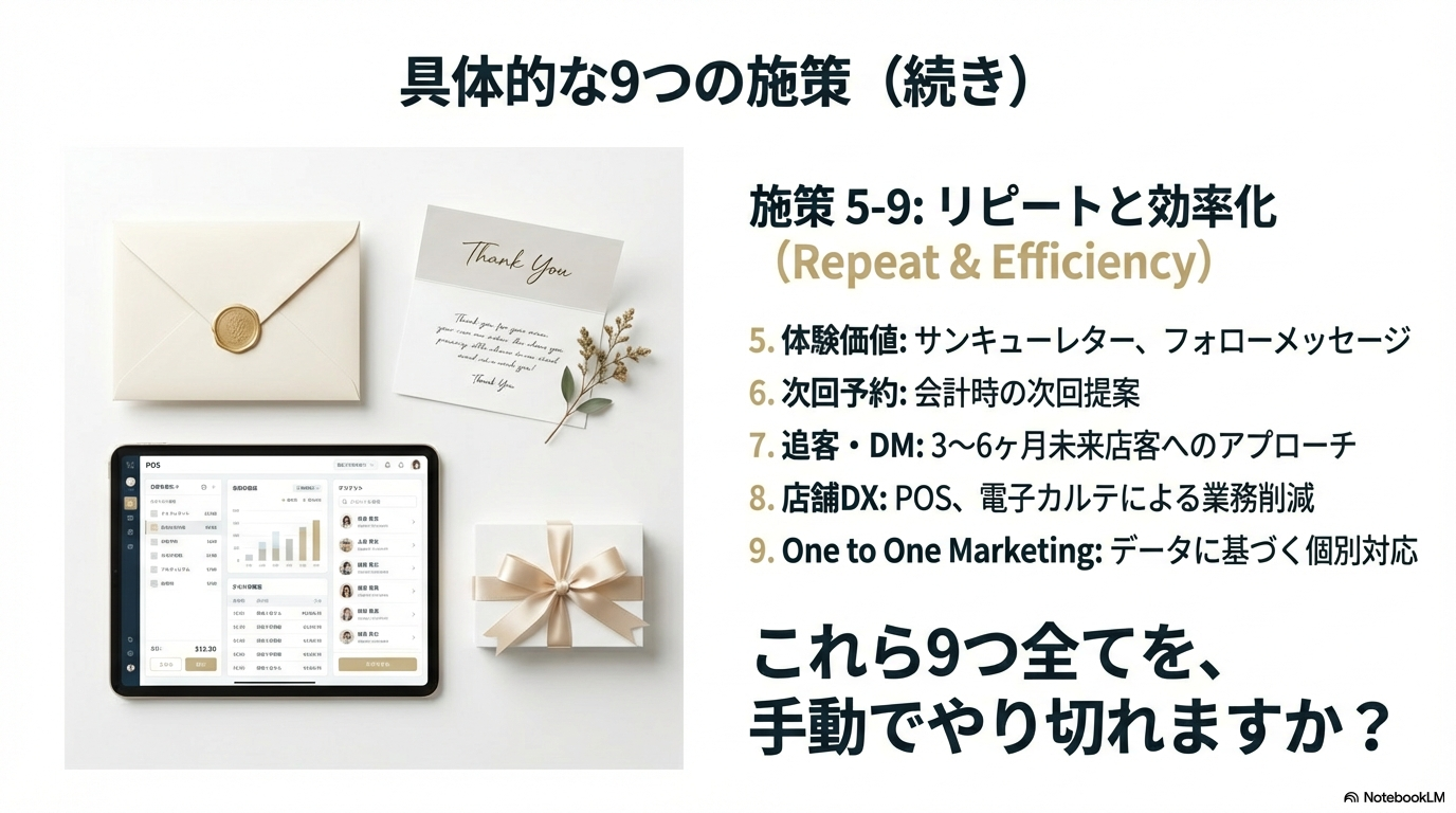 特に「リピート強化」と「業務効率化」は、マンパワーに頼らずシステムで解決する時代です。