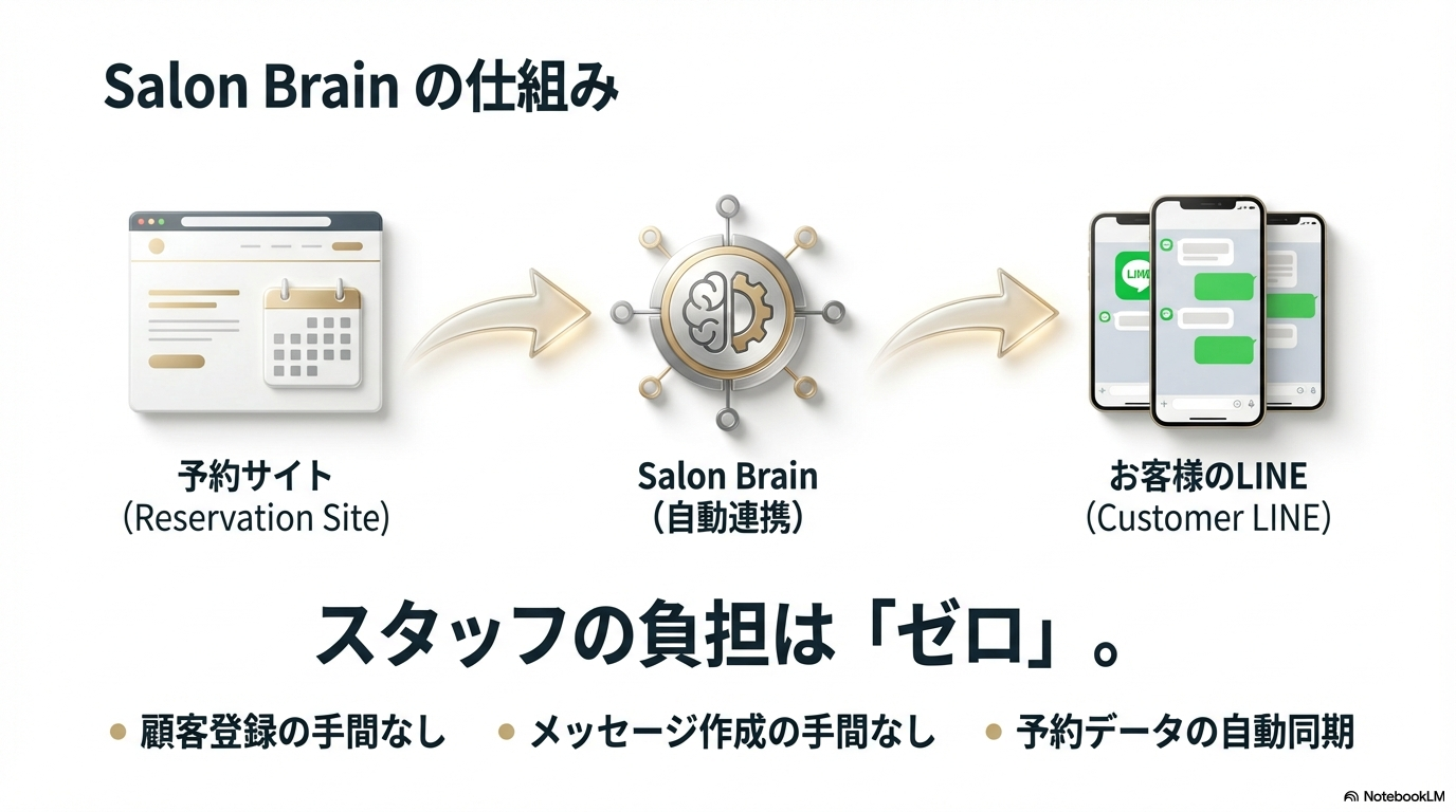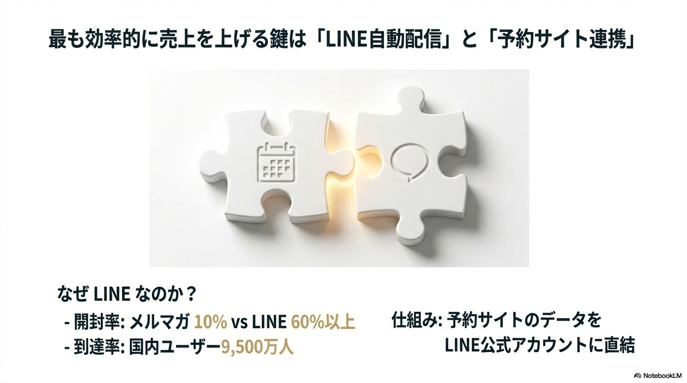 売上アップ施策をすべて手動で行うのは限界があります。そこで鍵となるのが「LINE」と「予約システム」の連携です。