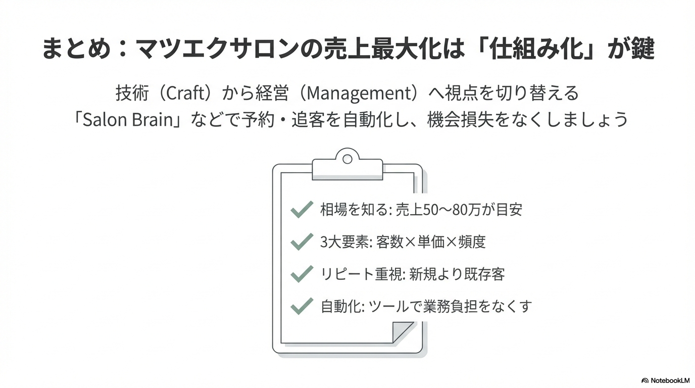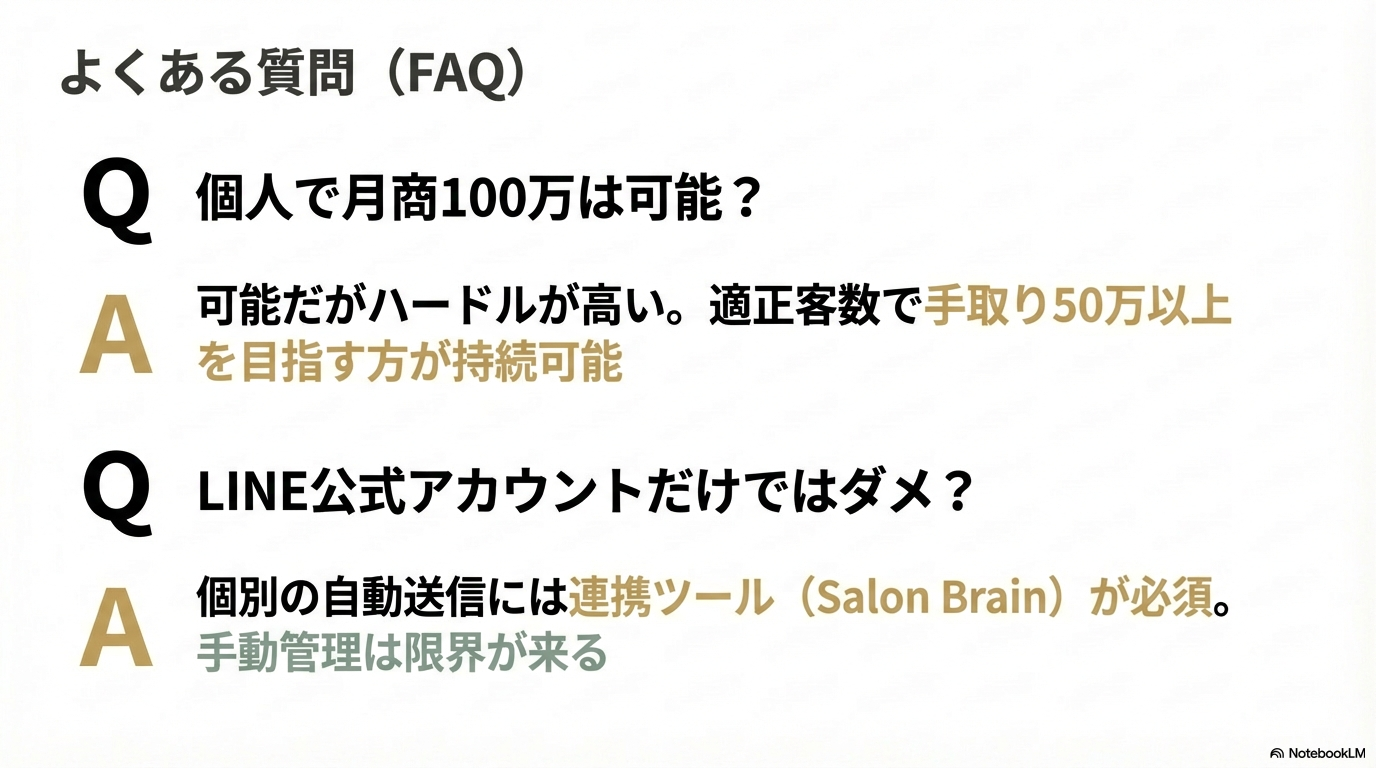 サロン経営者の悩みは尽きません。結論から申し上げますと、個人サロンの健全な月間売上目安は50〜80万円、手取りは30〜50万円程度が一般的です。しかし、これ以上の売上を目指す場合、マンパワーだけでは限界が訪れます。
