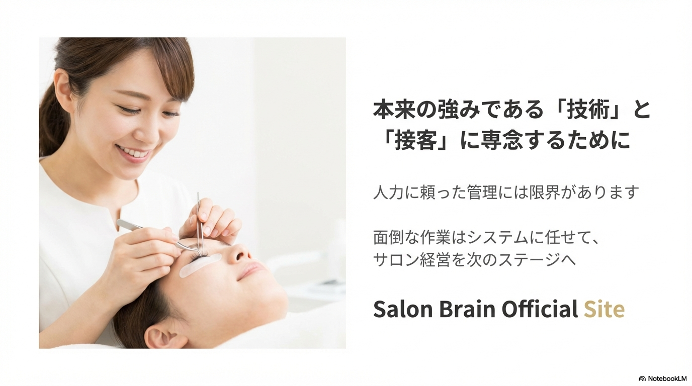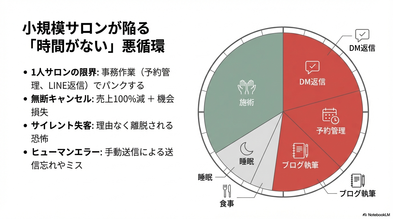 多くのオーナーが、施術以外の事務作業(予約管理、メッセージ送信、SNS更新)に追われ、本来注力すべき接客や経営改善の時間が奪われています。すべて手動・アナログで管理しようとすると、顧客数が増えるにつれて作業量がパンクしてしまいます。