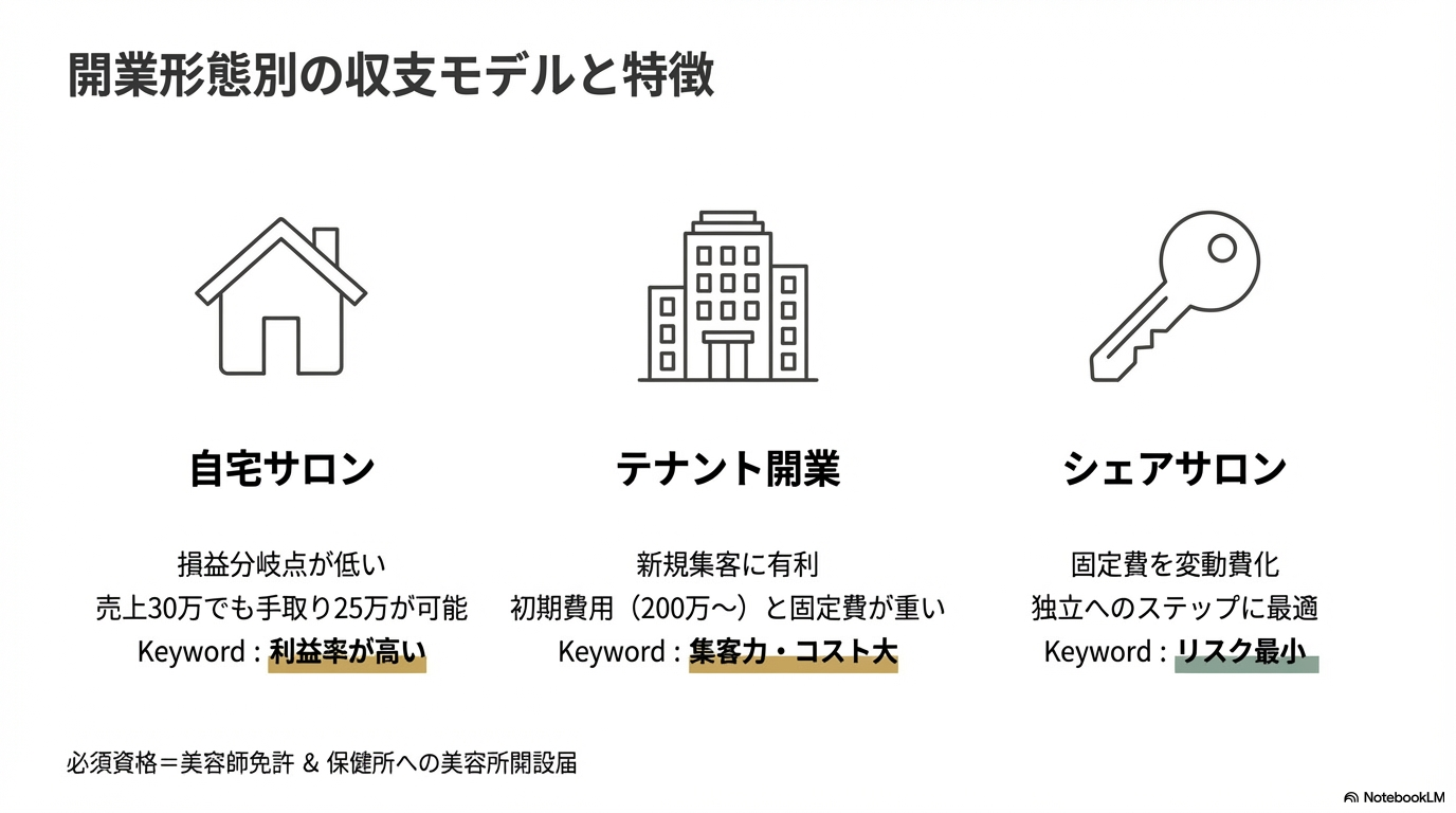 開業資金と固定費を最小限に抑えられ、損益分岐点が低いため黒字化しやすいモデルです。物件取得費や別途家賃が不要(または家計と按分)であり、通勤時間もゼロです。