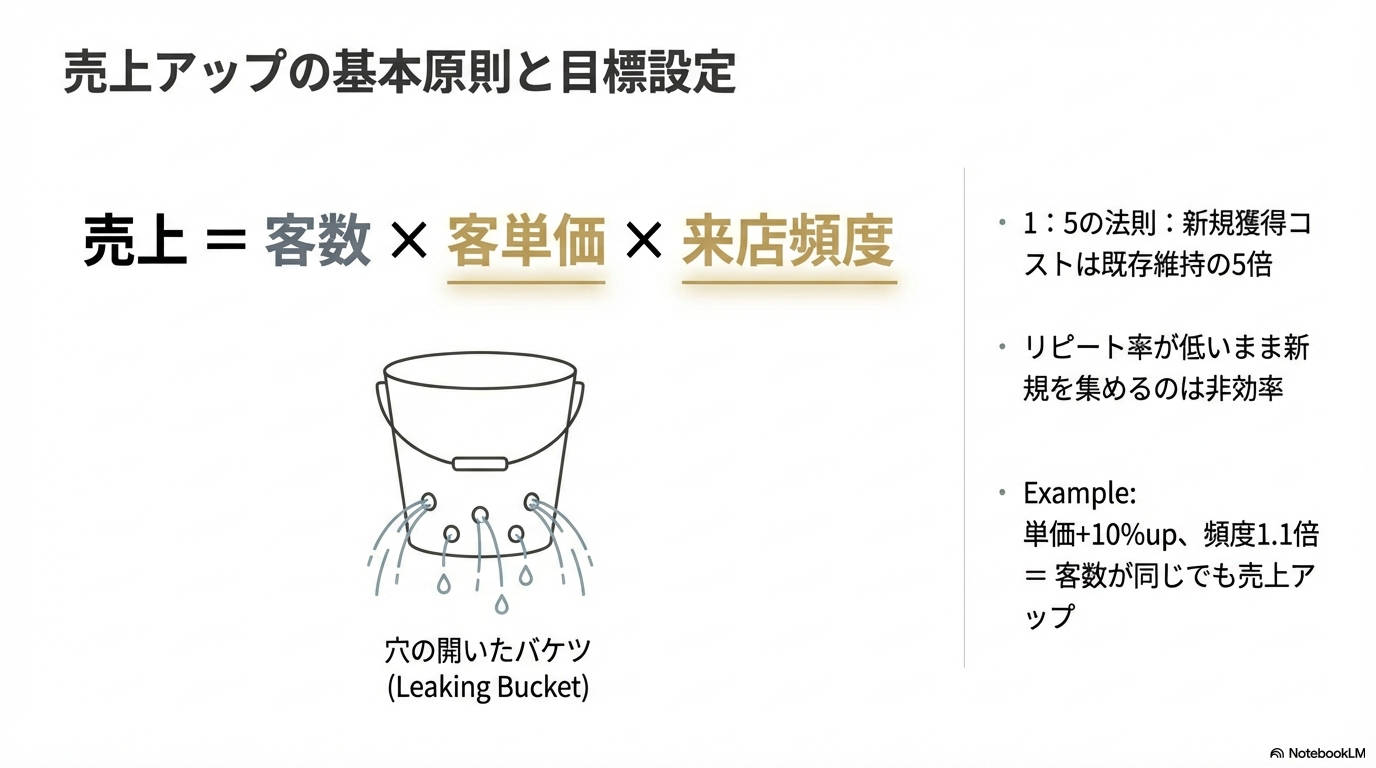 安定経営の鍵は「リピート率向上」にあります。新規客を獲得するコストは既存客維持の5倍(1:5の法則)かかると言われています。リピート率が低いまま新規を集め続けるのは「穴の開いたバケツに水を注ぐ」状態で、広告費ばかりがかさみ非効率です。