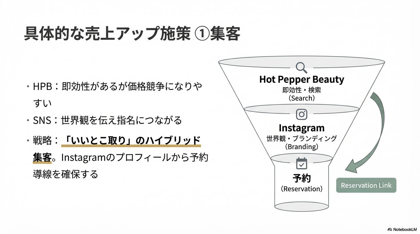 HPBで検索流入を確保し、Instagram等でブランディングを行う「いいとこ取り」が最強の集客戦略です。ホットペッパービューティー(HPB)は即効性がありますが価格競争になりやすく、SNS(Instagram等)は世界観を伝えやすく指名につながる一方、育つのに時間がかかります。