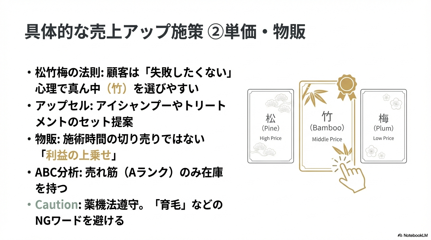 メニュー構成とカウンセリングで、自然な単価アップ(アップセル)を図ります。顧客には「失敗したくない」「より良い効果が欲しい」という心理があります。通常メニューに加え、アイシャンプーやトリートメント付きのセットメニュー(松・竹)を用意し、カウンセリング時に「持ちを良くしたいならこちらがおすすめです」とメリットを提示することで、上位メニューが選ばれやすくなります。