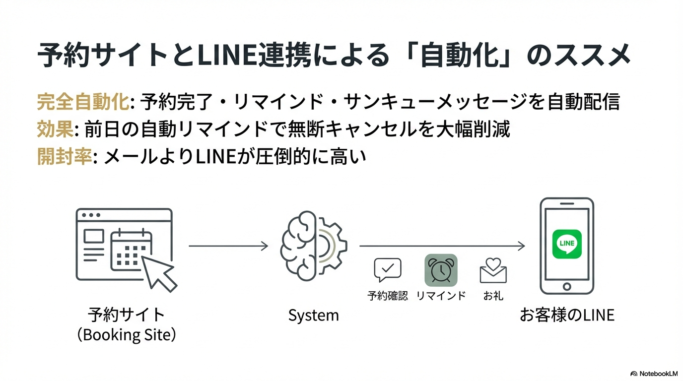 予約システムとLINE公式アカウントを連携させることで、メッセージ配信を自動化します。ホットペッパー等からの予約情報を取り込み、来店前日に「明日お待ちしております」というリマインドLINEを自動配信することで、無断キャンセルを大幅に削減できます。LINEは開封率が高いため、メールよりも圧倒的に効果的です。