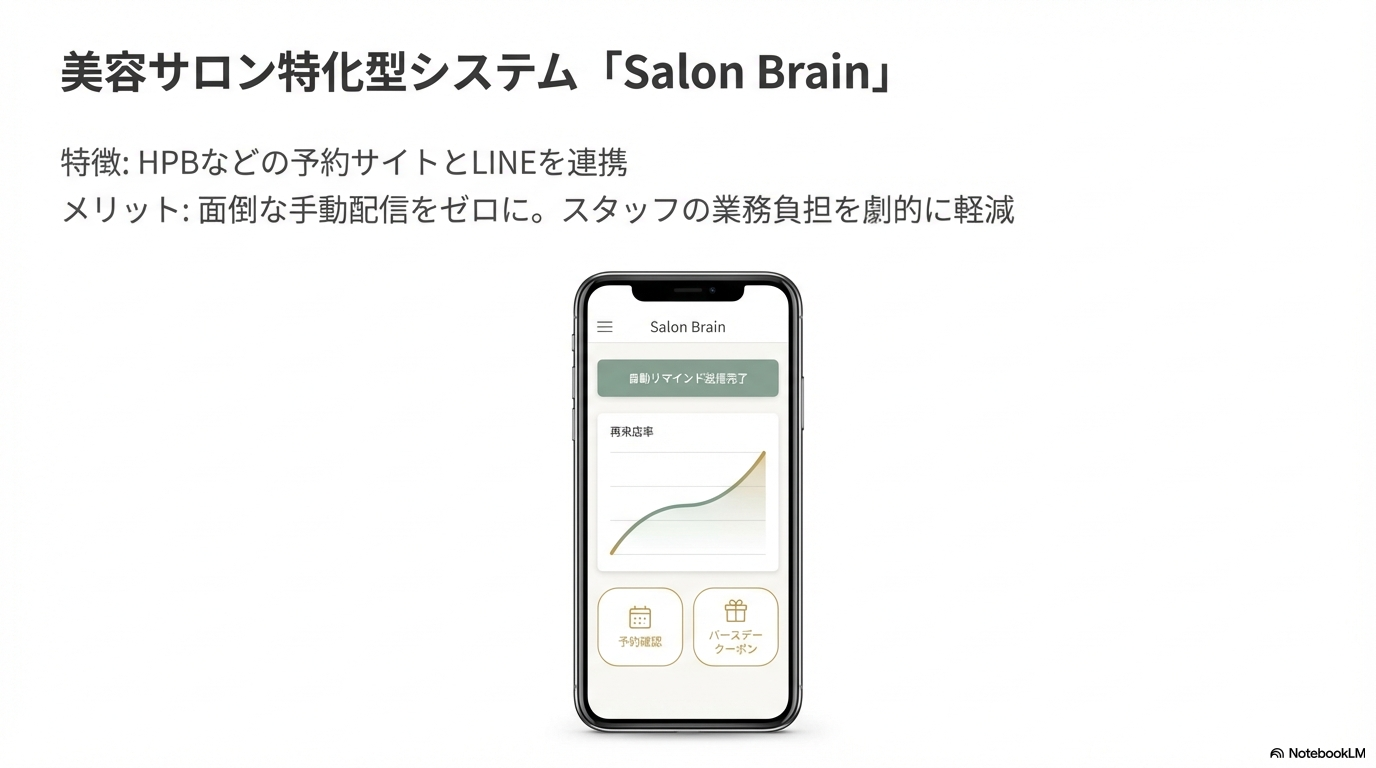 これらの自動化を一括で実現できるのが、美容サロン特化型ツールの「Salon Brain(サロンブレイン)」です。予約サイト(HPBなど)とLINEを連携し、予約確認、来店後のお礼、リマインド、バースデークーポン等を全自動で配信します。