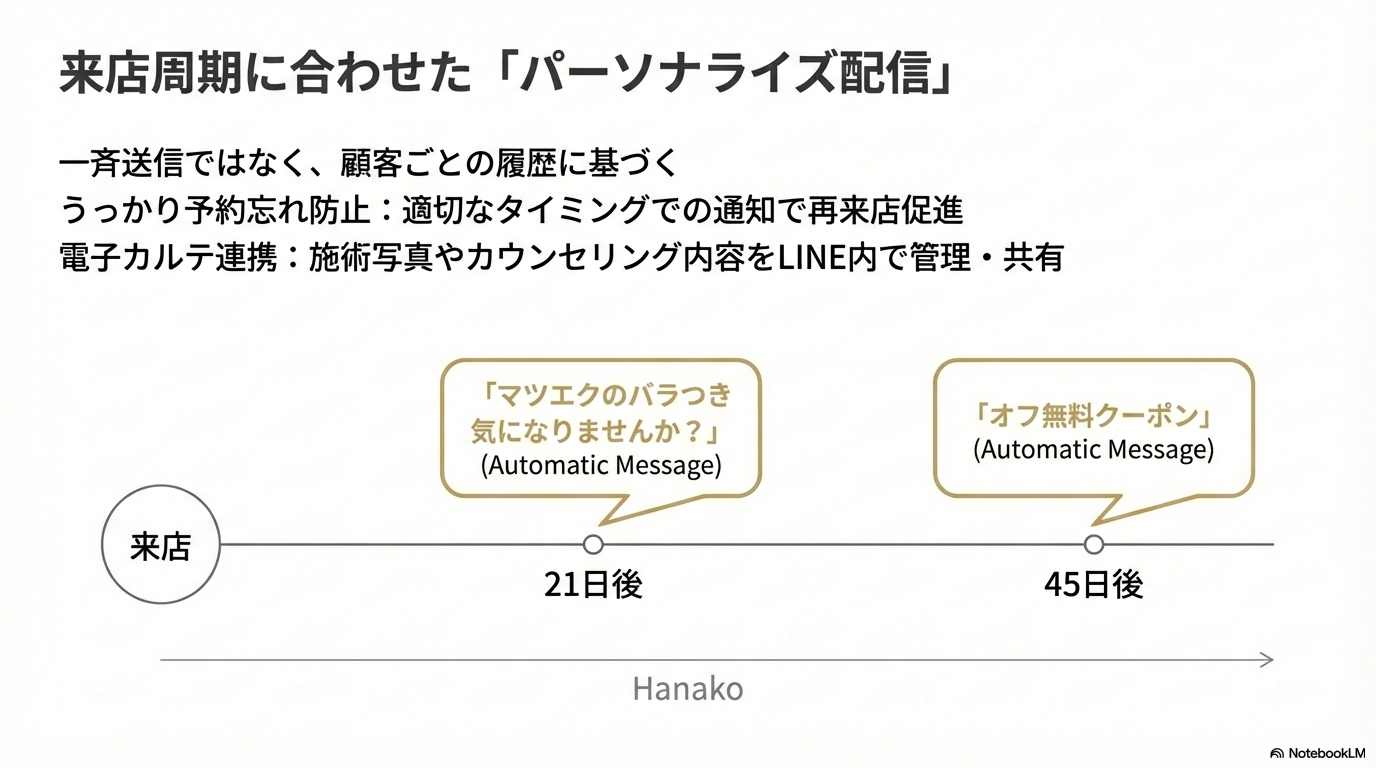 一斉送信のメルマガではなく、顧客ごとの来店履歴に基づいたメッセージを自動で送ります。来店から3週間後に「マツエクのバラつき気になりませんか?」、45日後に「オフ無料クーポン」などを自動配信することで、顧客の「うっかり予約忘れ」を防ぎ、再来店を促進します。