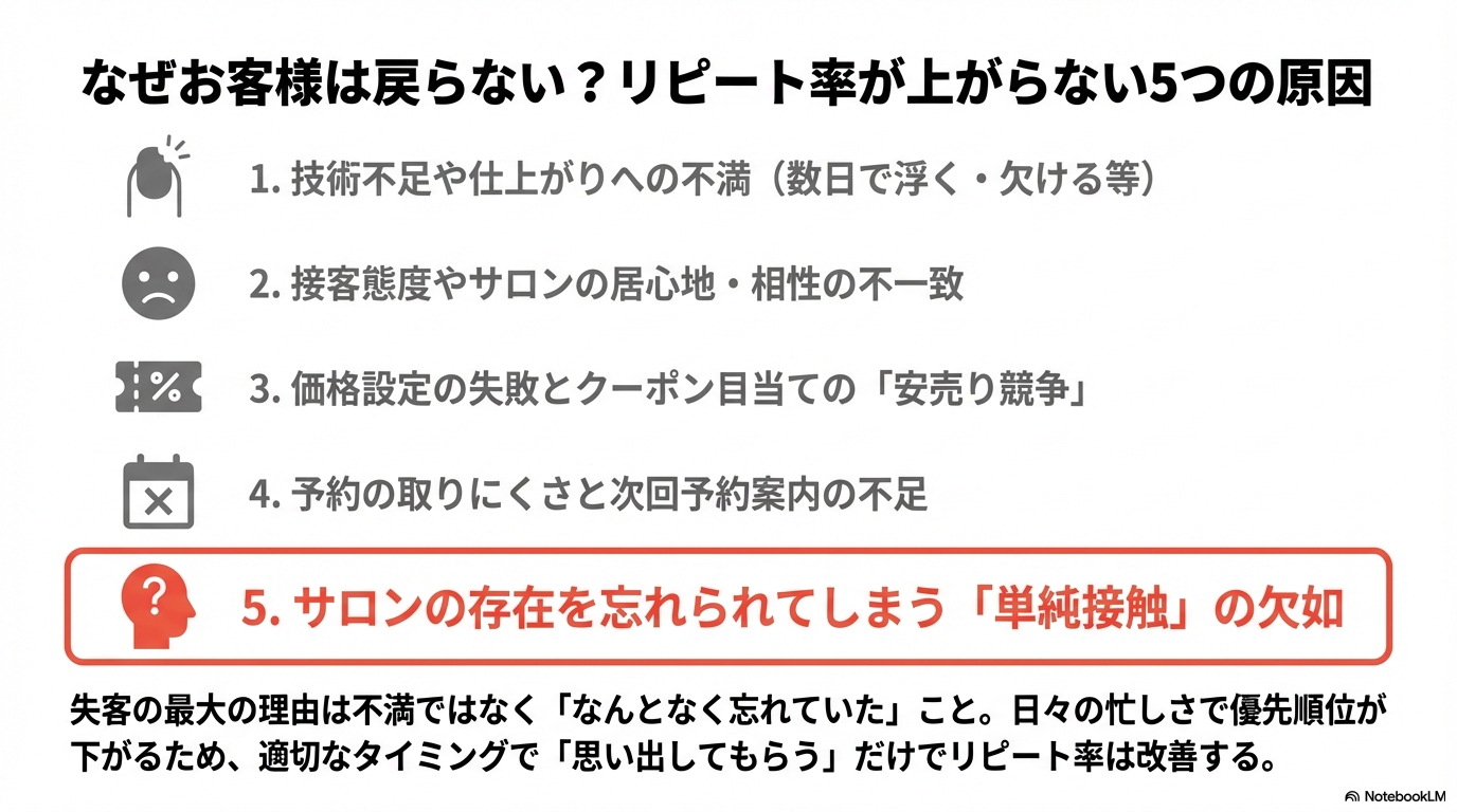 特別な不満がなくても、日々の忙しさの中でサロンの優先順位が下がり、来店間隔が空いてしまうことはよくあります。心理学の「ザイオンス効果(単純接触効果)」が示すように、定期的な接触がないと親近感や記憶は薄れていきます。逆に言えば、適切なタイミングで思い出してもらうだけで、リピート率は改善します。