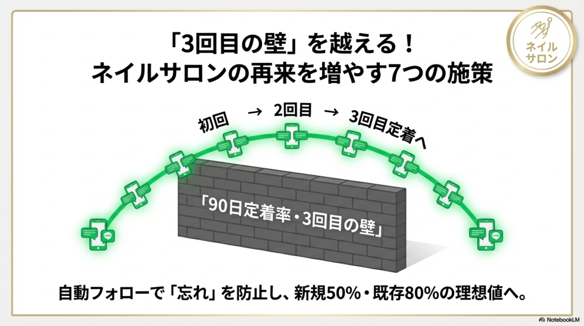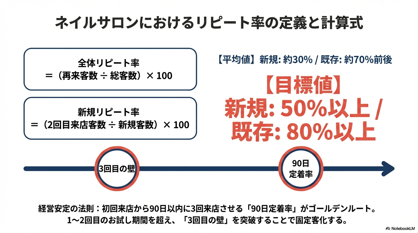 特に重要なのが「90日定着率」です。初回の来店から90日以内に3回来店してもらうことが、固定客化へのゴールデンルートです。そのためには、初回から3回目までの期間に集中的なフォローを行い、来店を習慣化させる施策が不可欠となります。