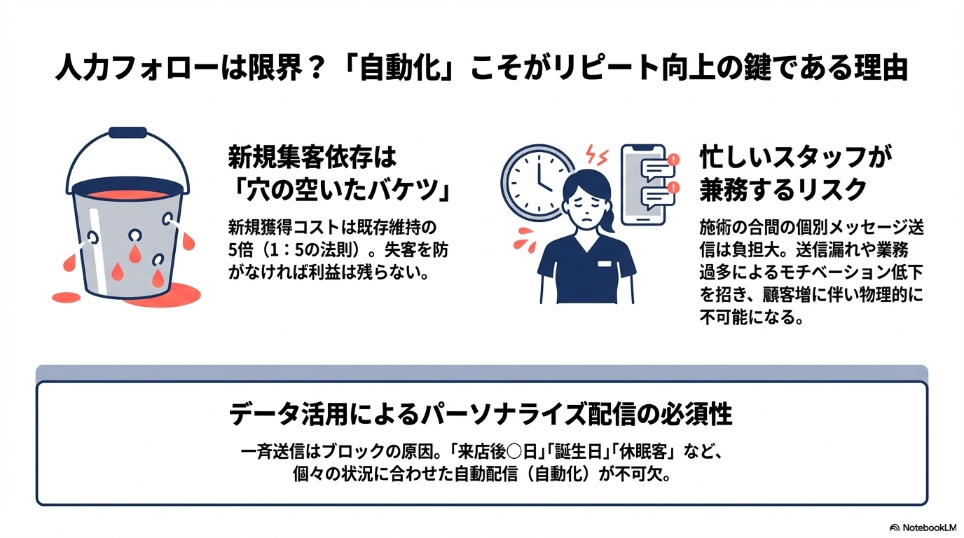 顧客数が増えるほど、人力でのきめ細やかなフォロー(パーソナライズ)は物理的に不可能になります。