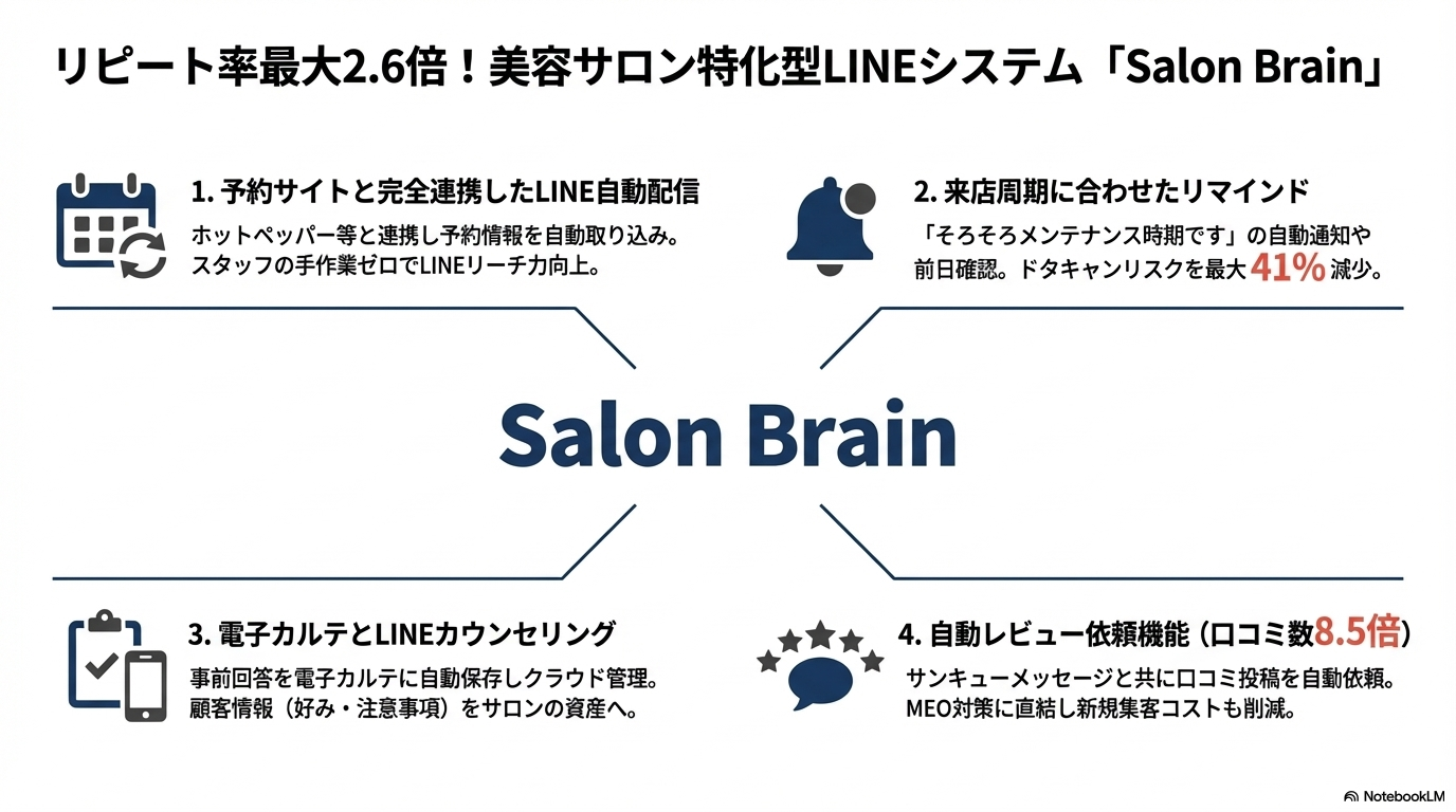 サロンのリピート率を劇的に改善し、業務効率化を実現するツールとして、美容サロン特化型LINEシステム「Salon Brain(サロンブレイン)」をご紹介します。