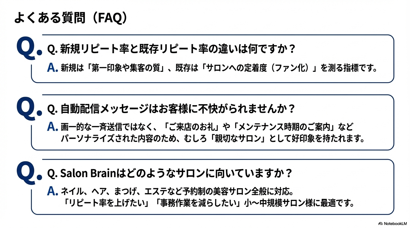 A. 一斉送信のような画一的な内容ではなく、「来店のお礼」や「そろそろメンテナンス時期」といったパーソナライズされた内容であれば、むしろ「親切なサロン」として好印象を持たれます。Salon Brainではお客様ごとに最適なタイミングと内容で配信可能です。