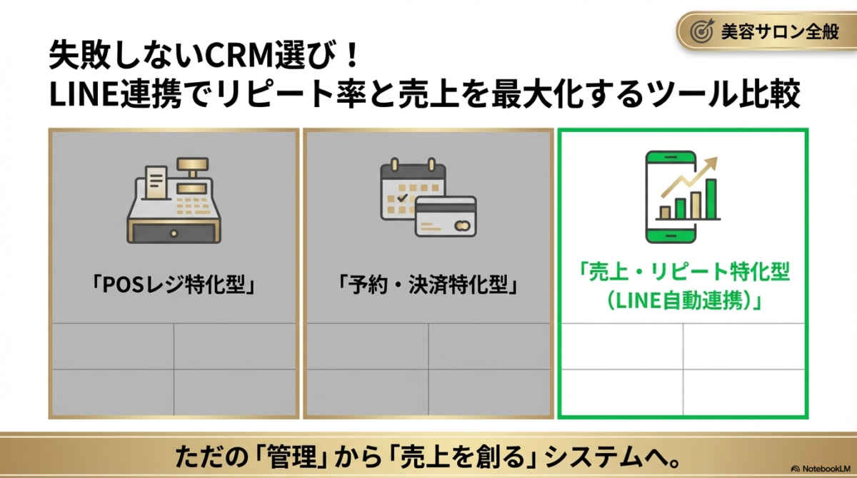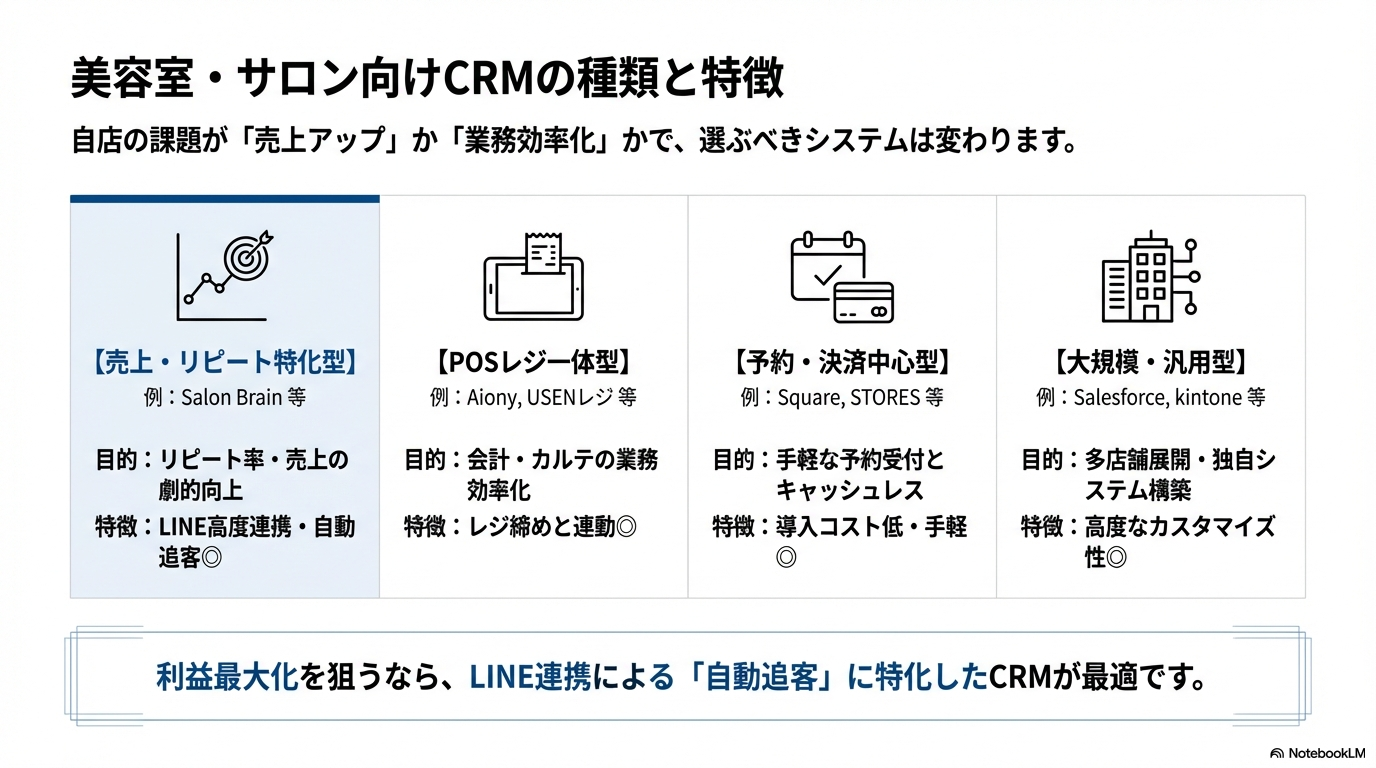 美容室やサロン向けのCRM(顧客関係管理システム)は、その機能や目的によって大きく4つのタイプに分類されます。自店の課題が「売上アップ」なのか「業務効率化」なのかによって選ぶべきツールは異なります。それぞれの特徴を見ていきましょう。
