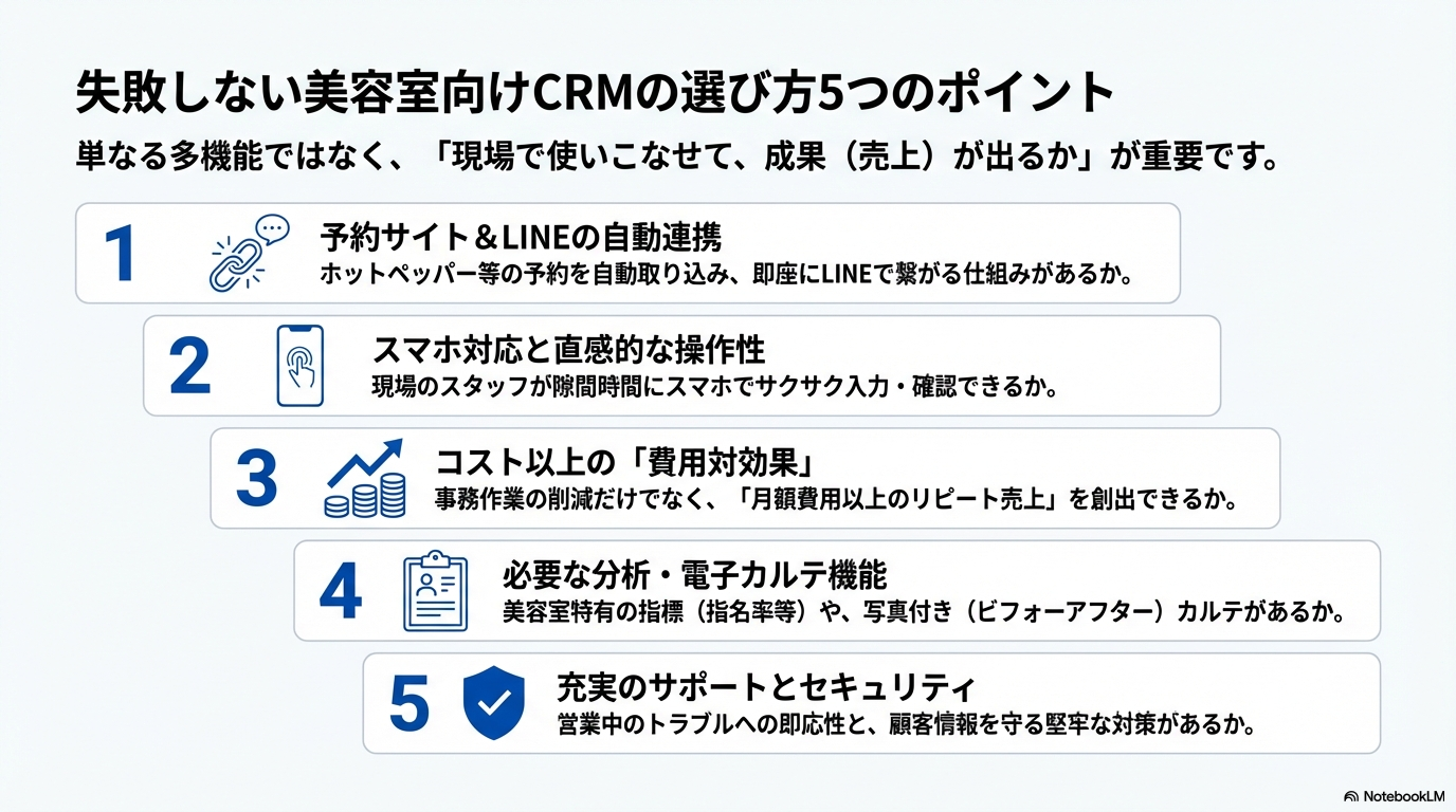 CRM導入で失敗しないためには、単なる機能の多さではなく「現場で使いこなせて、成果が出るか」が重要です。以下の5つのポイントを確認しましょう。