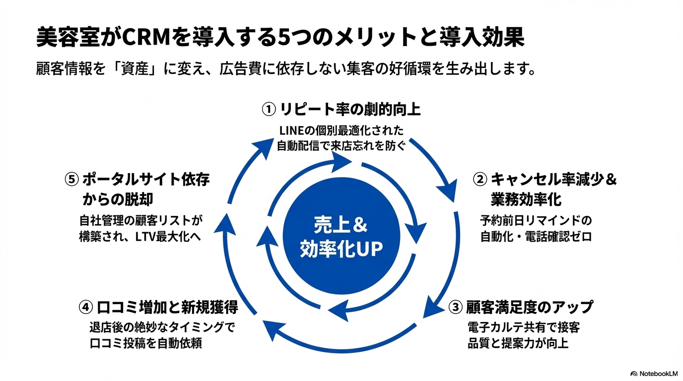 CRMを導入することで、サロン経営にはどのようなメリットがあるのでしょうか。具体的な効果を5つ紹介します。