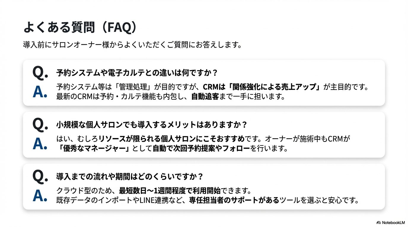 A. はい、むしろリソースが限られる個人サロンこそ、導入メリットが大きいです。オーナーが施術に集中している間も、CRMが自動で次回予約の提案やフォローを行い、一人二役の「優秀なマネージャー」として機能してくれます。事務作業を自動化することで、接客品質の向上に注力できます。