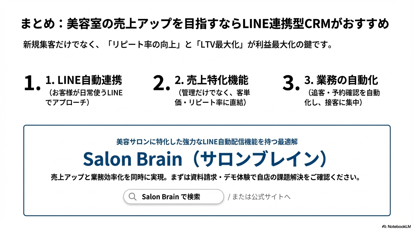 数あるCRMの中でも、美容サロンに特化し、LINE連携による強力な自動配信機能を持つ「Salon Brain」は、売上アップと業務効率化を同時に実現する最適解と言えます。まずは資料請求やデモ体験で、自店の課題がどう解決するか確認してみてはいかがでしょうか。